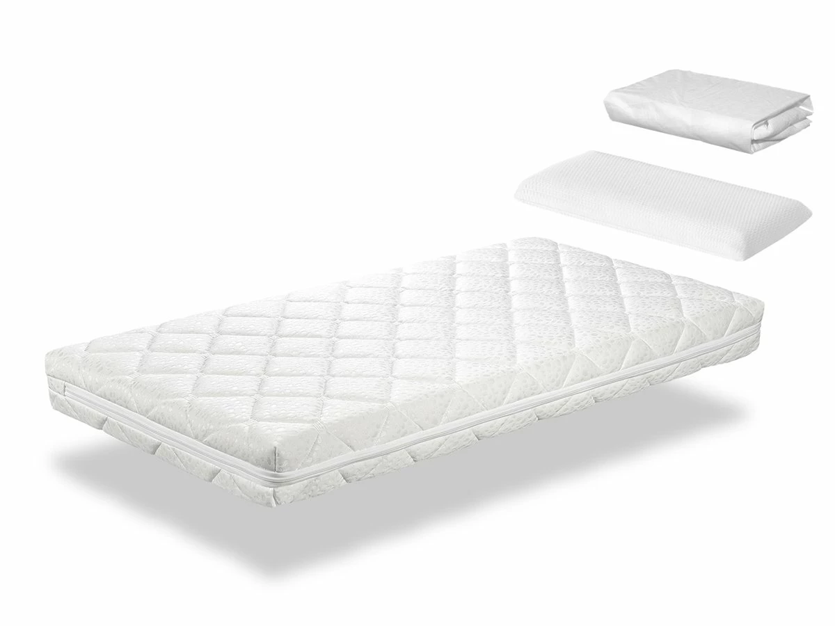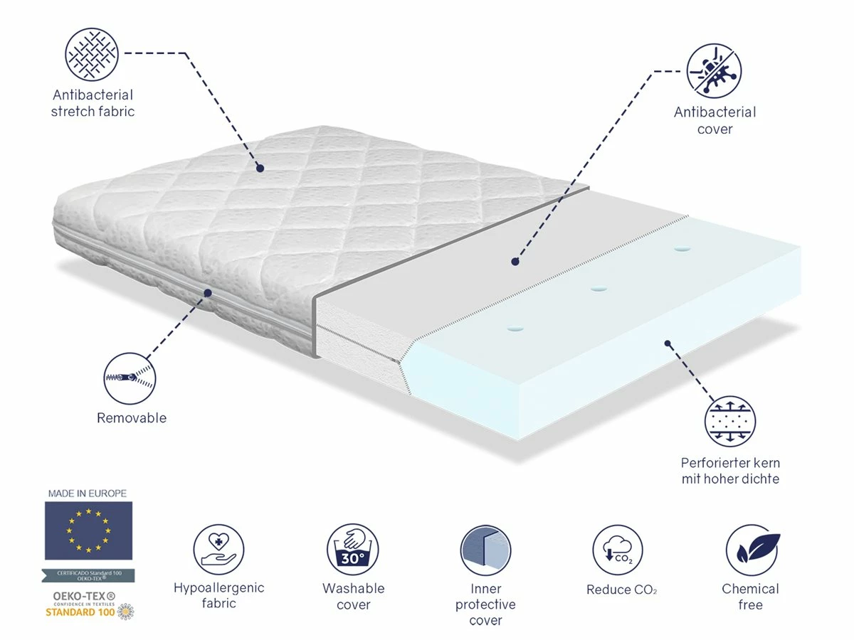 Espuma de última generación con microperforación que garantiza una buena ventilación eliminando el calor y la humedad. La espuma tiene la densidad suficiente para adaptarse al cuerpo del niño y eliminar las zonas de presión reduciendo la inquietud nocturna. Reducie los canales de ventilación de CO2. Transpirable.