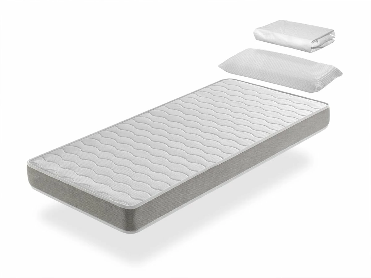 ❤️ [FICHA TÉCNICA] La altura total: 14 cm Firmeza: 2/5 Suave Dimensiones: Disponible en diferentes medidas. Consúltanos Material del núcleo: Espuma de poliuretano altamente transpirables Material exterior: 100% poliéster Acabados: en tonos grises y blancos Contenido del pack: Colchón APOLO + almohada viscoelástica junior + Protector de colchón🛌 [SUEÑO CÓMODO Y REPARADOR] APOLO es un modelo ligero, fresco y cómodo. Juvenil, moderno y minimalista, capaz de sorprender desde lo más peques de la casa hasta un público más exigente. Es un colchón cuya altura de 14 cm es perfecto para ser utilizado en camas convertibles, sofás camas, camas de infante, camas Montessori etc… El núcleo de espuma y de firmeza suave permite una buena distribución de los puntos de presión para un máximo confort.Reversible. Dos modos: Verano / Invierno.✅ [ALMOHADA VISCOELASTICA JUVENIL]La almohada viscoelástica se adapta por completo a tu cuerpo para garantizar cada noche la mejor postura para el cuello. Su núcleo 100% de espuma viscoelástica de 50kg/m3, está formado con canales de aireación para permitir el paso del aire y disipar del calor. Alivia tensión de cuello y cervicales. Suave acogida, adaptable sin hundir la cabeza. La altura de la almohada es de 7 cm lo que permite mantener la postura perfecta para nuestro pequeño.Cuenta con dos fundas. La funda exterior está confeccionada con tejido natural y de alto gramaje compuesto tejido strech elástico. La funda interior es de protección.[SÁBANA PROTECTORA DE COLCHON]Protector de colchón absorbente y silencioso. Impermeable y muy transpirable: la membrana de poliuretano bloquea perfectamente todos los líquidos, la transpiración, la orina y los fluidos corporales dejando pasar el aire.Hipoalergénico y Suave. Composición sábana de rizo: 50%tencel, 50% poliéster con base de poliuretano. Faldón ajustable: 100% poliéster.Tratamiento antiácaros y antibacteriano que impide la proliferación de ácaros y bacterias. Actúa como barrera higiénica y mantiene el colchón protegido.✨ [GARANTIA DE SATISFACCIÓN] Fabricación: Somos fabricantes europeos y empleamos materiales europeos Certificados: Envío: enrollado con plástico en una caja de cartón protectora