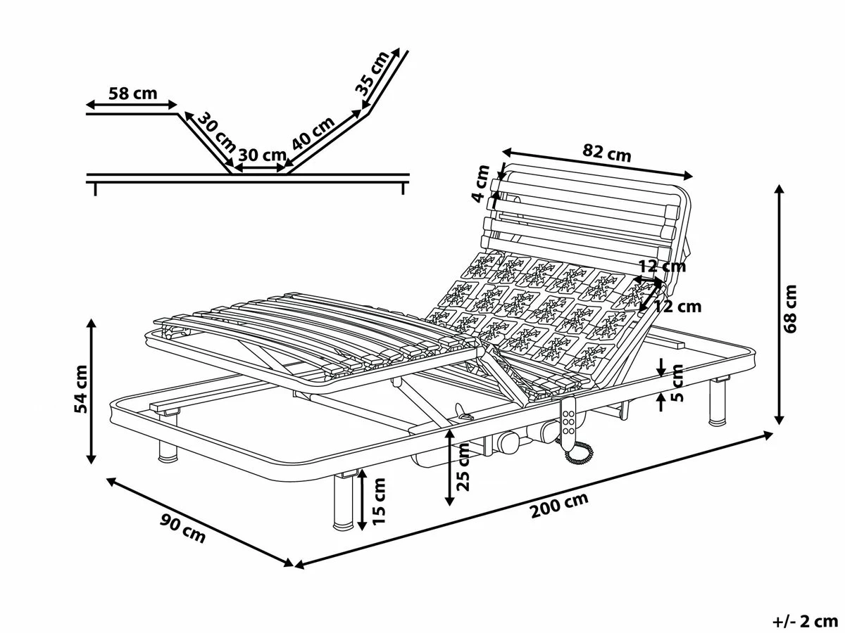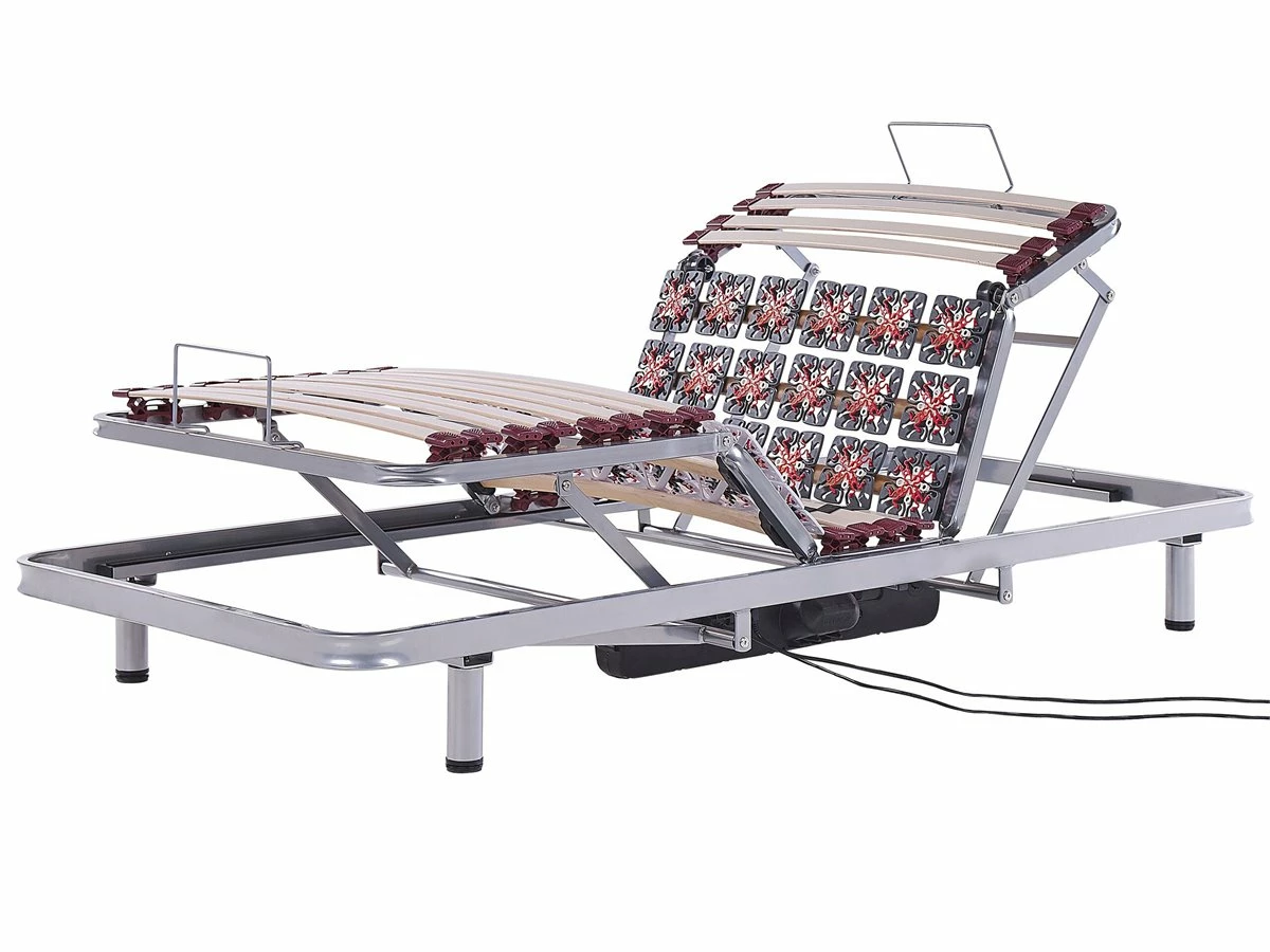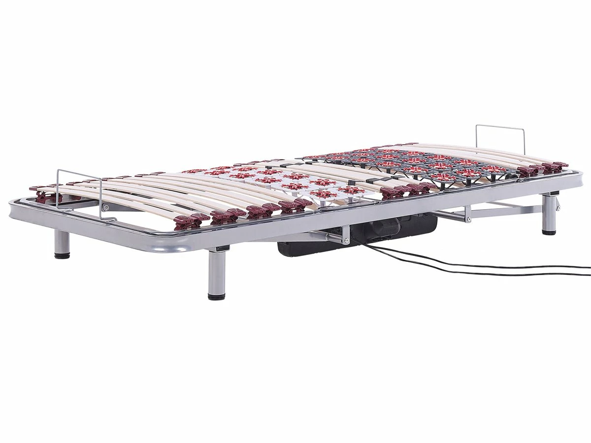 Somier regulable. Mejora la calidad de tu descanso con este somier articulado. Está fabricado a partir de metal fuerte y resistente. Las láminas flexibles de madera de abedul permanecen firmes gracias a los fijadores de goma. La estructura permite un ajuste eléctrico regulable con mando a distancia. Se adapta a todo tipo de colchones. Detalles: Tipo de Producto: Somier ajustable eléctricamente Color: Plateado Tipo de material: Acero Material principal: Acero Material adicional: Madera de abedul Tipo de ajuste: Eléctrico Número de patas: 4 Número de listones: 26 Dimensiones: Ancho: 90 cm Longitud: 200 cm Altura: 25-68 cm Superficie para dormir: 90×200 cm Peso: 38 kg Capacidad de peso: 180 kg La oferta incluye: 1 x Somier Ventajas: Distribución uniforme del peso corporal, Estructura duradera y sólida, Durable y robusto, Fabricación sólida y precisa, Ajustable a través de control remoto, Patas con tapas anti-deslizantes Información de montaje: No requiere montaje. 20-40 min. Consejos de mantenimiento: Acero: Limpie el somier con un paño húmedo.